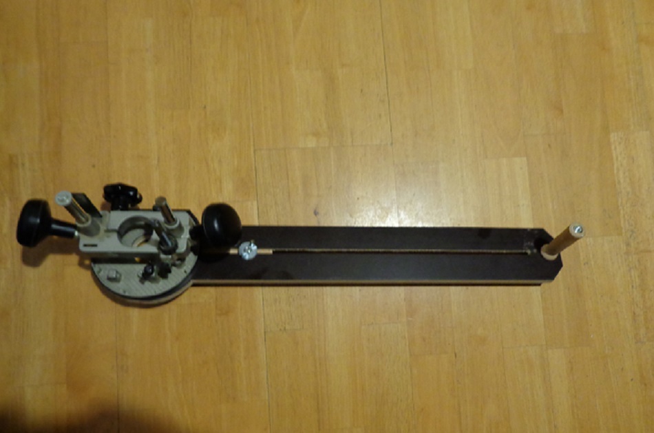 Hier ist ein Fräszirkel für Oberfräsen ich denke von den Bildern und der Skizze ist genug ersichtlich so das nicht viel weitere Beschreibung nötig ist .Frässzirkel Pos.1 ist gefräst durchgehend ,daher kann Pos 2 Radiuseinsteller unter die Fräserhalterung fast bis zum Fräser geschoben werden .